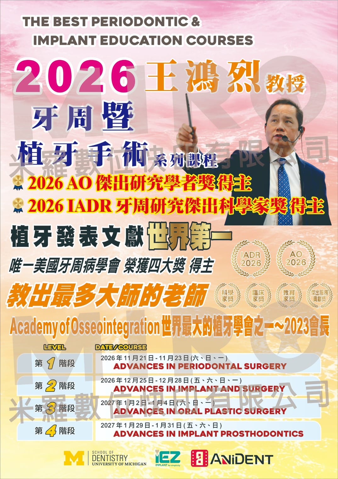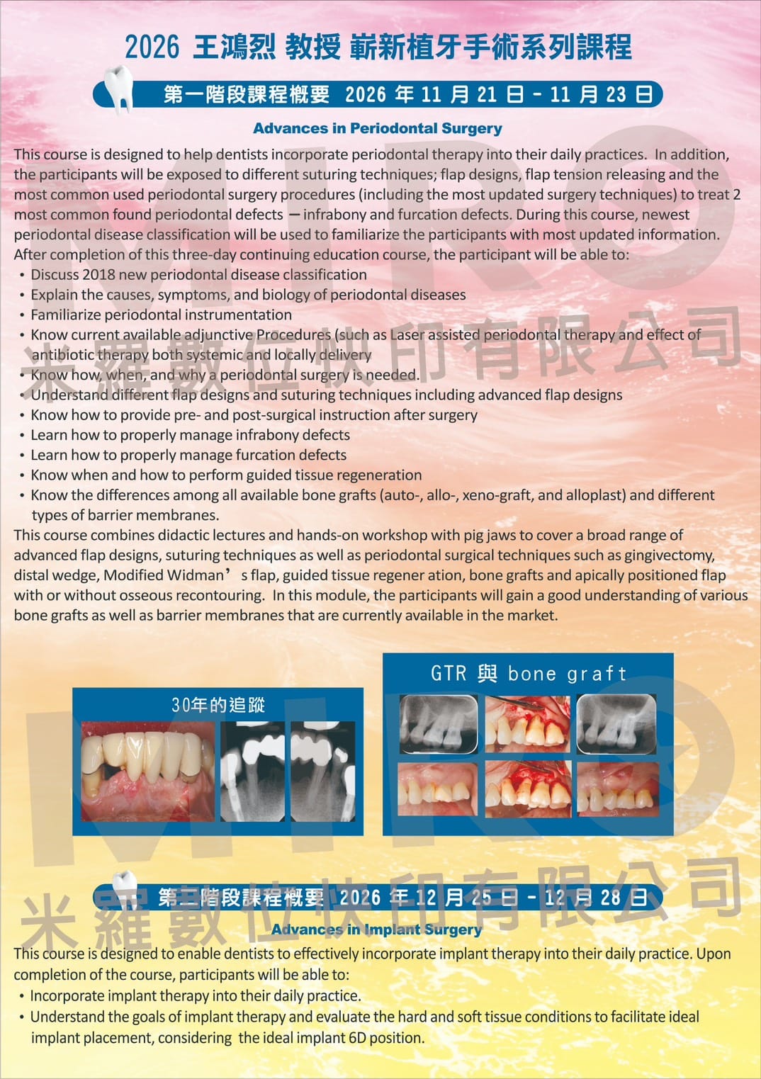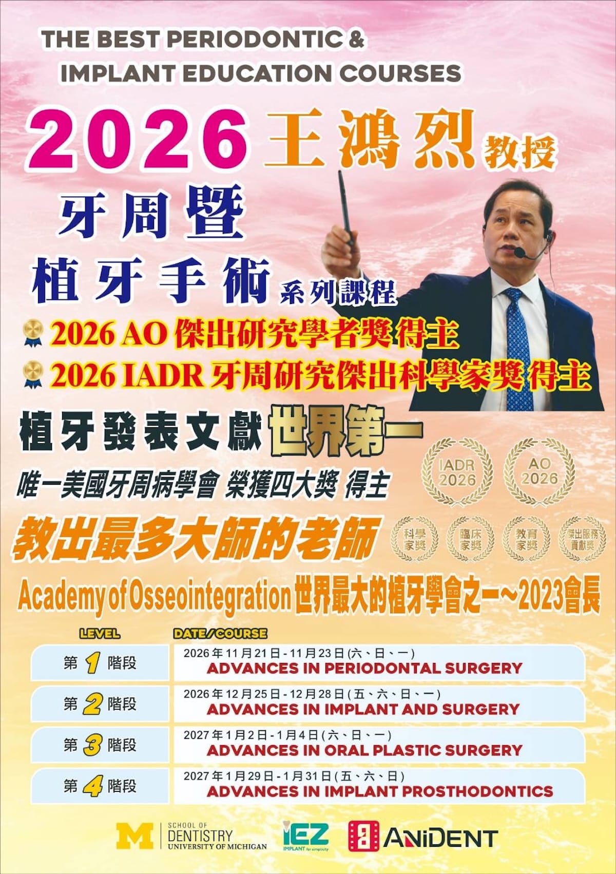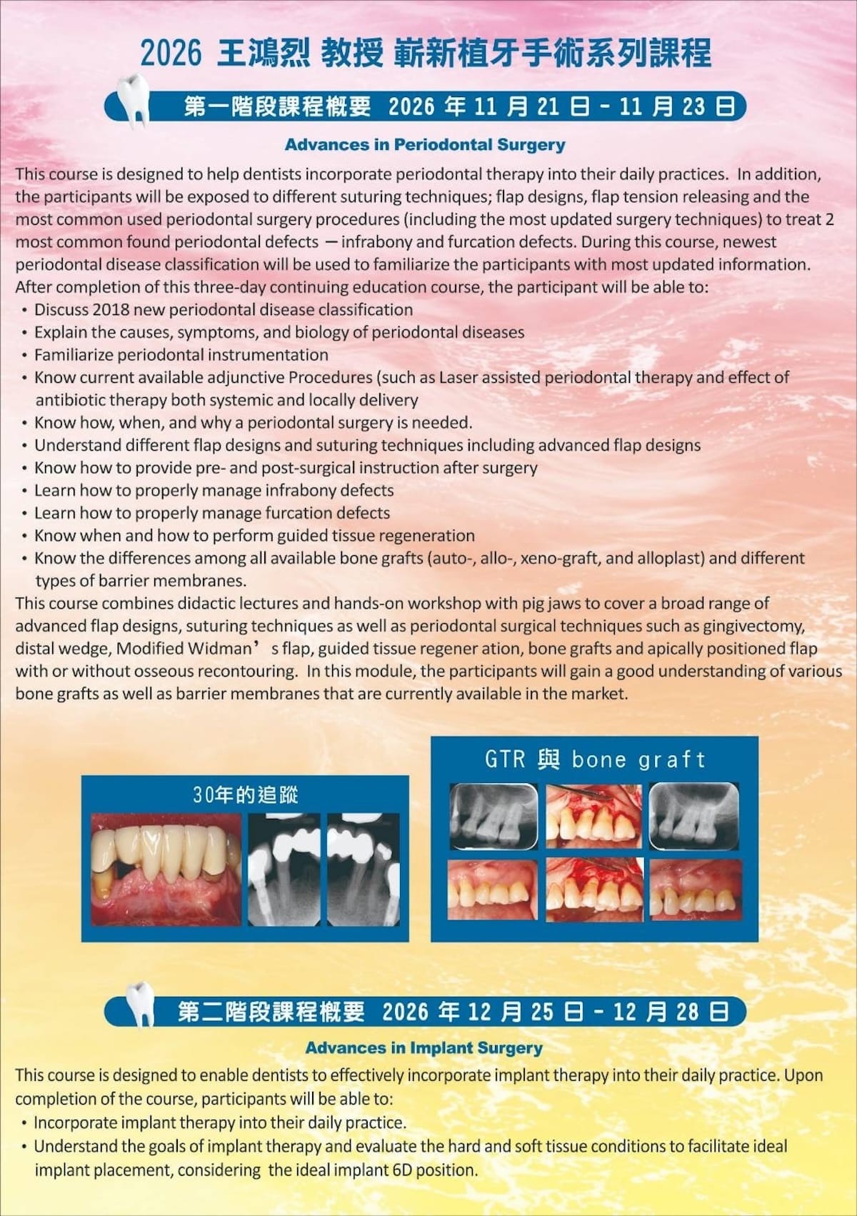 本系列課程由 王鴻烈教授 親自授課,透過系統化課程設計與臨床案例解析,帶領學員深入理解牙周與植牙治療的核心觀念,並搭配 Hands-on 實作訓練,協助醫師提升臨床決策與手術能力。