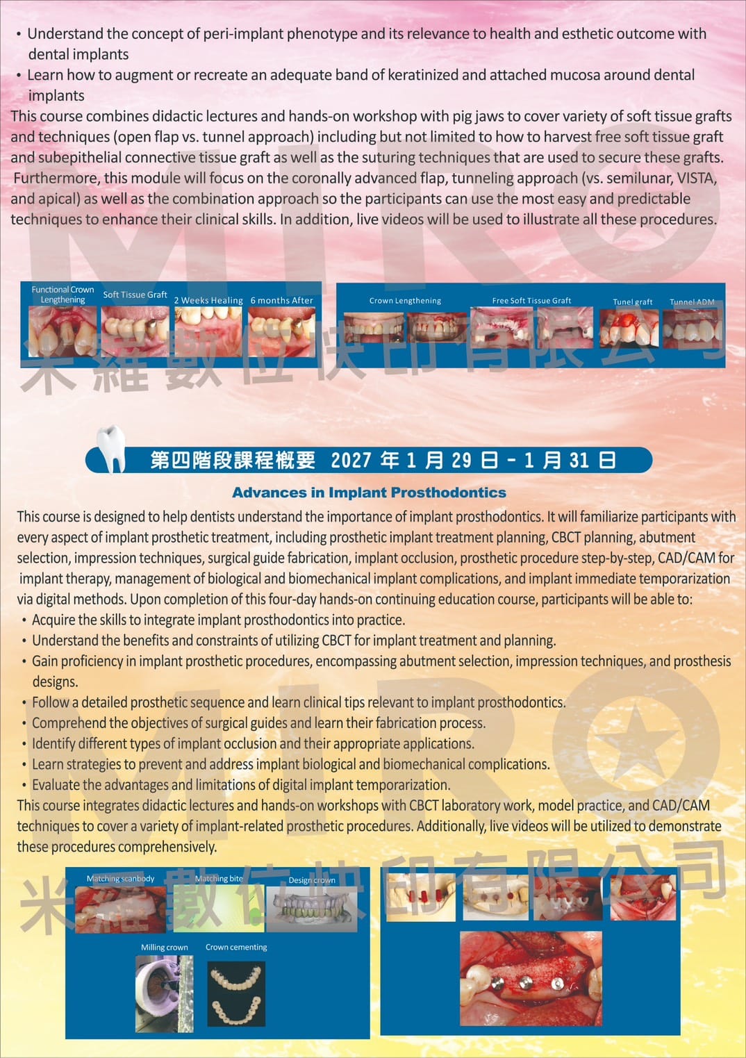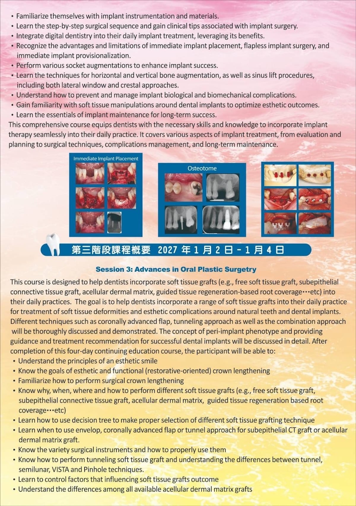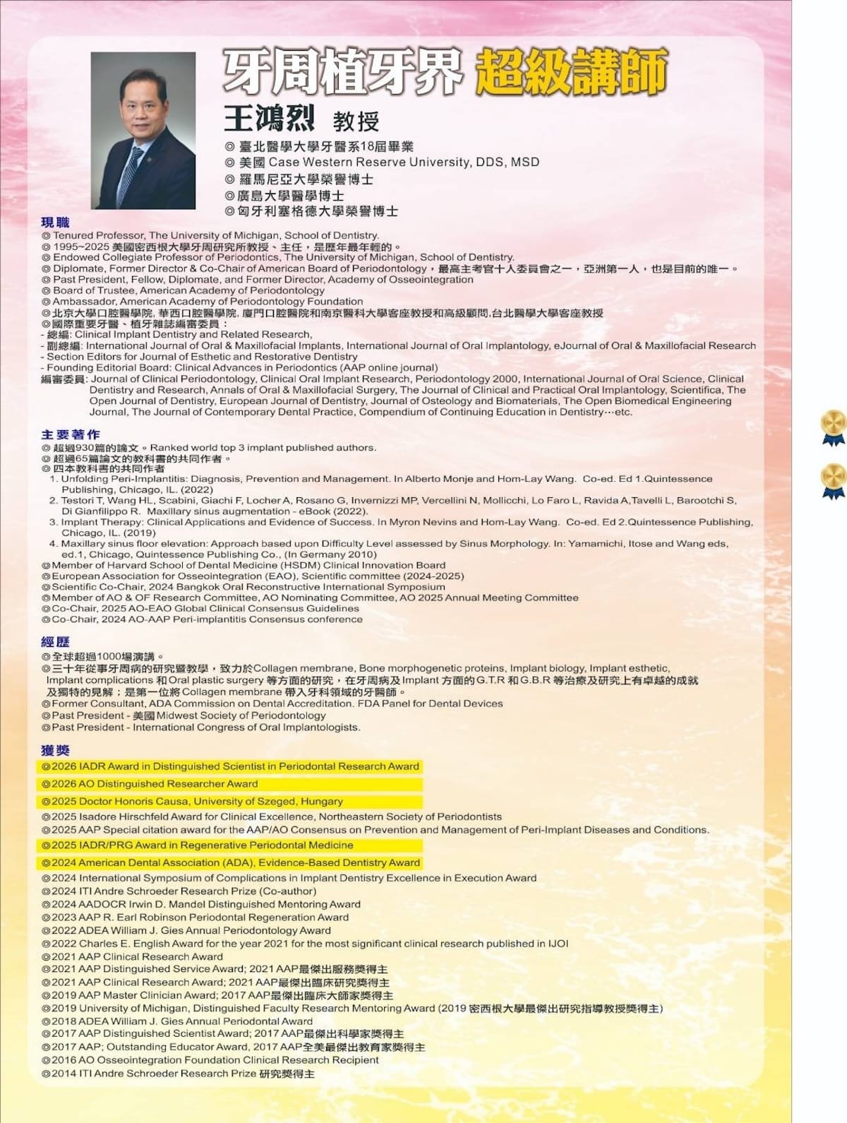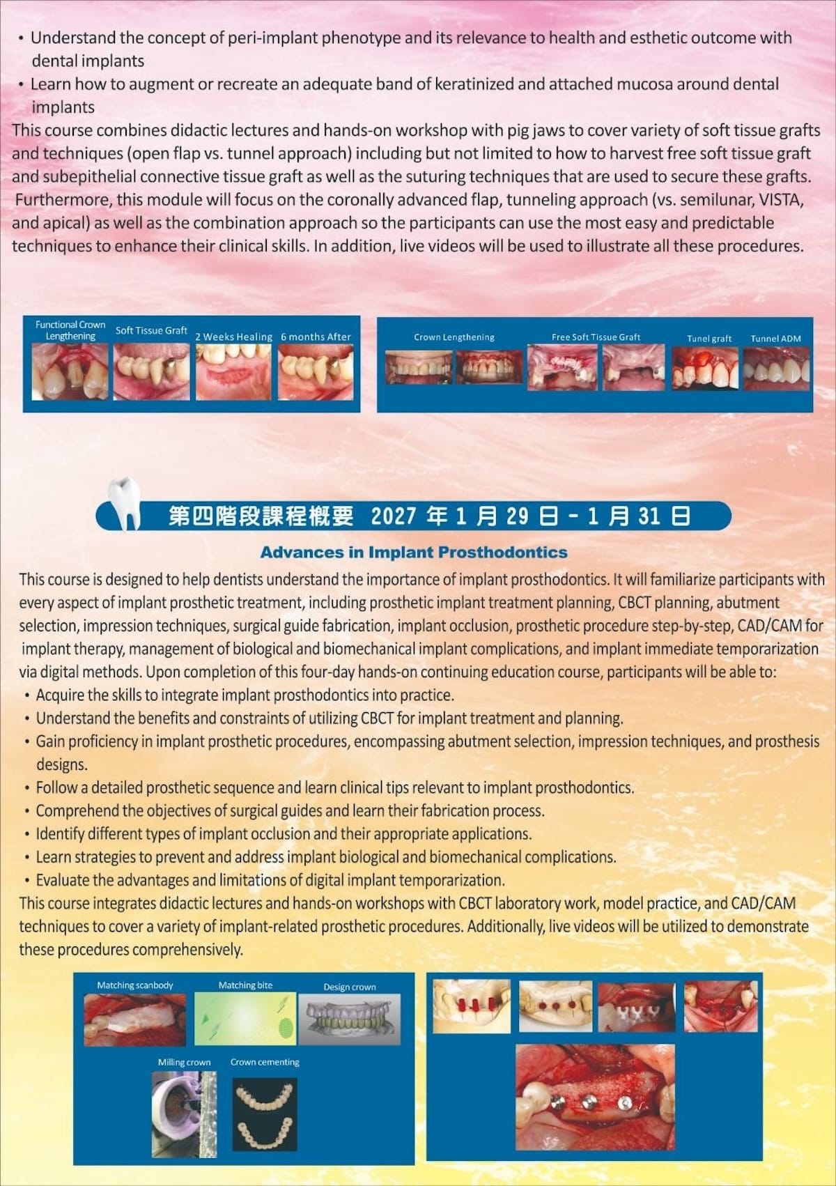 本系列課程由 王鴻烈教授 親自授課,透過系統化課程設計與臨床案例解析,帶領學員深入理解牙周與植牙治療的核心觀念,並搭配 Hands-on 實作訓練,協助醫師提升臨床決策與手術能力。