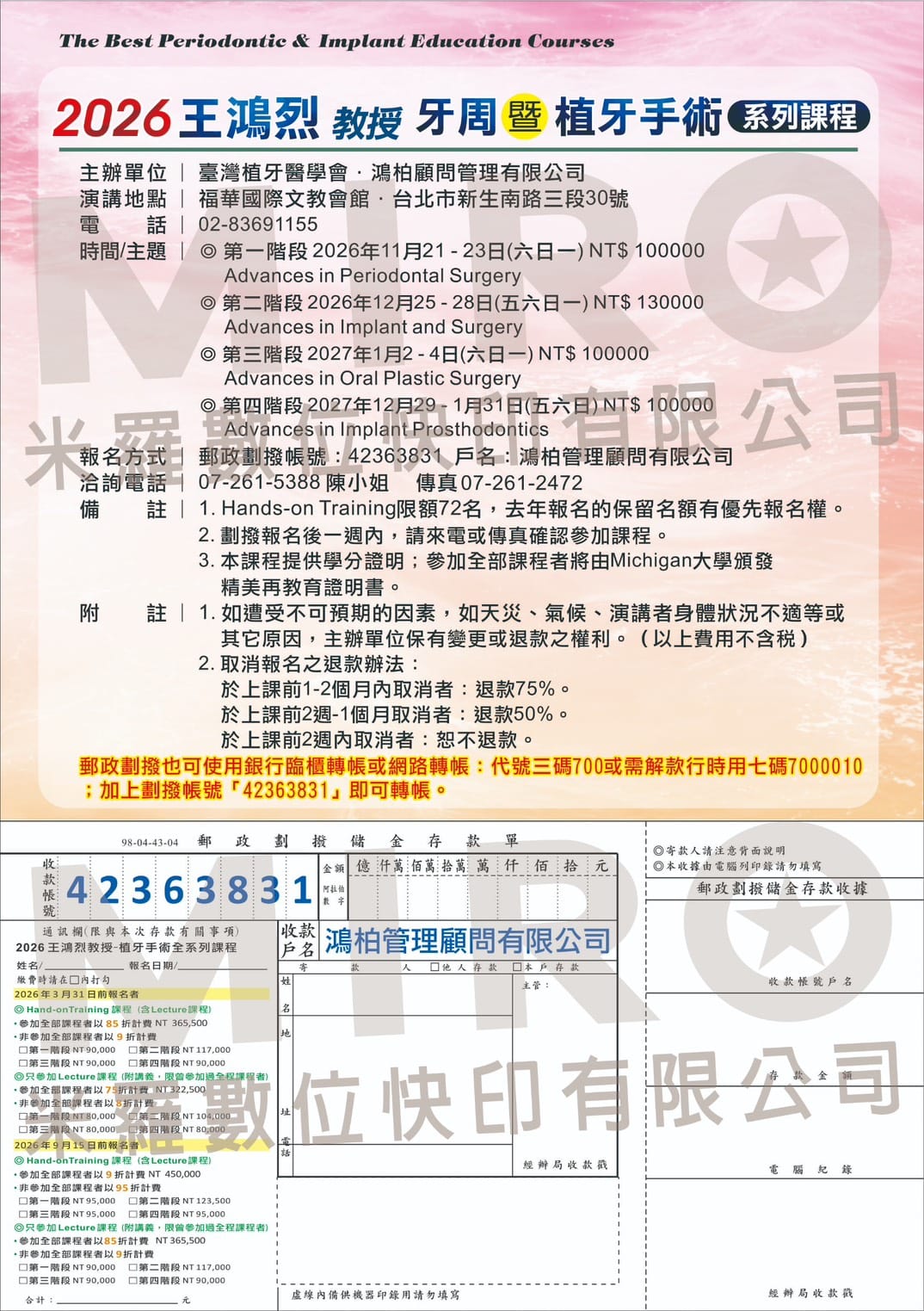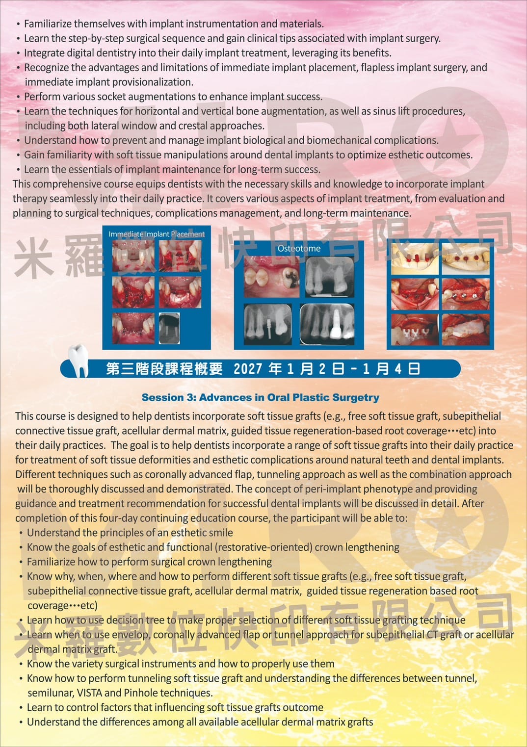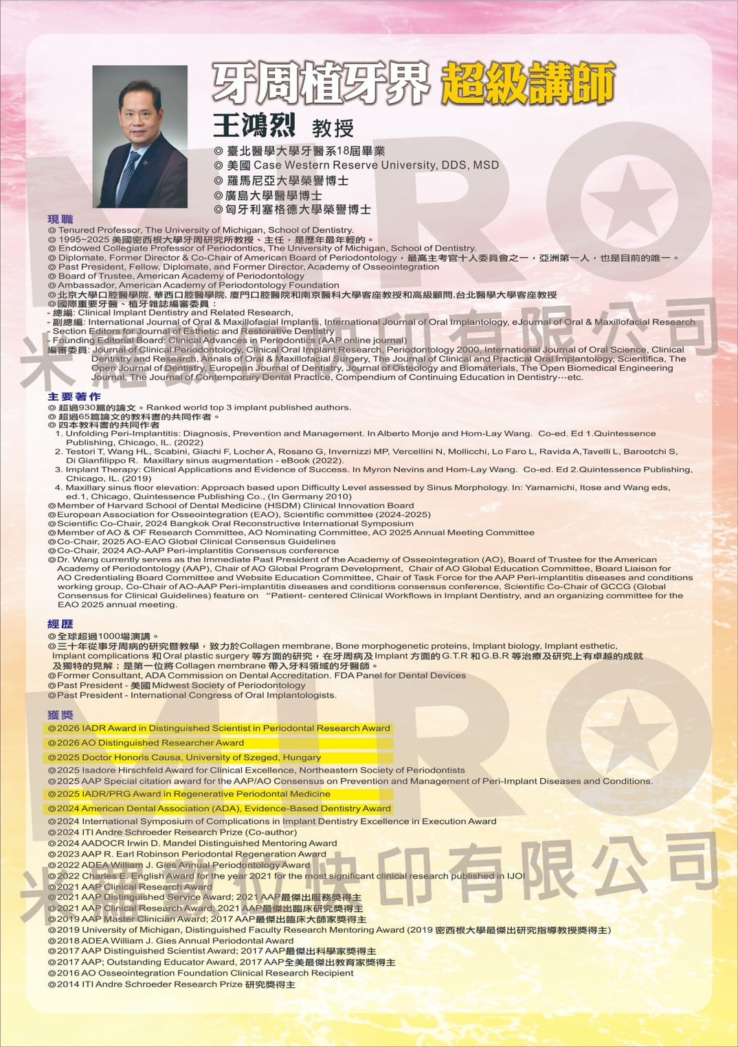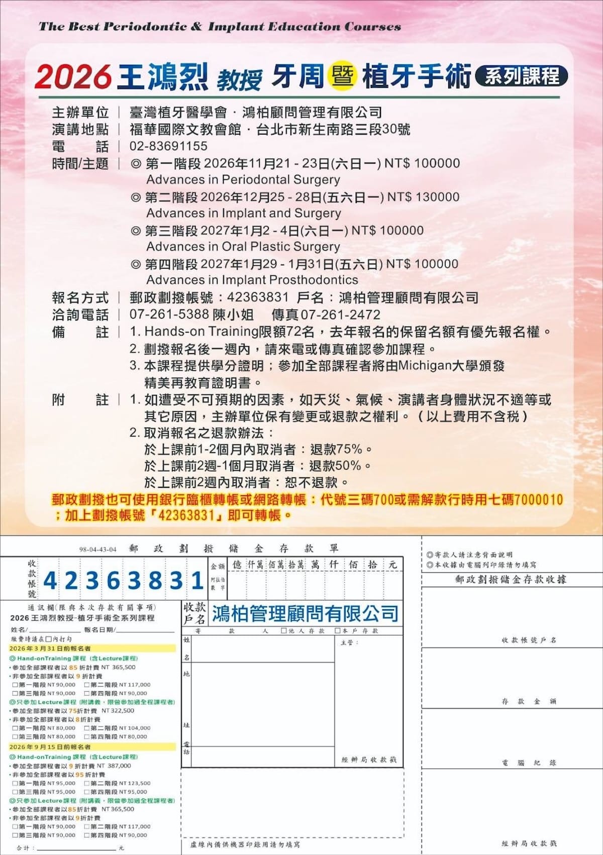 本系列課程由 王鴻烈教授 親自授課,透過系統化課程設計與臨床案例解析,帶領學員深入理解牙周與植牙治療的核心觀念,並搭配 Hands-on 實作訓練,協助醫師提升臨床決策與手術能力。